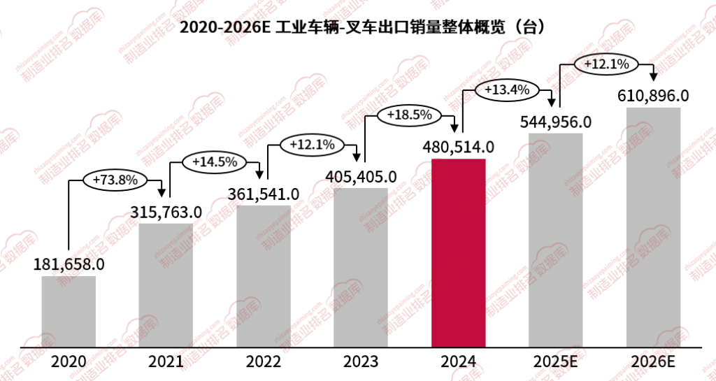 2026年,中国叉车出口将会延续稳健增长态势,随着电动化技术持续迭代、龙头企业全球化布局深化,以及海外市场需求持续释放,2026年将会突破60万台大关。